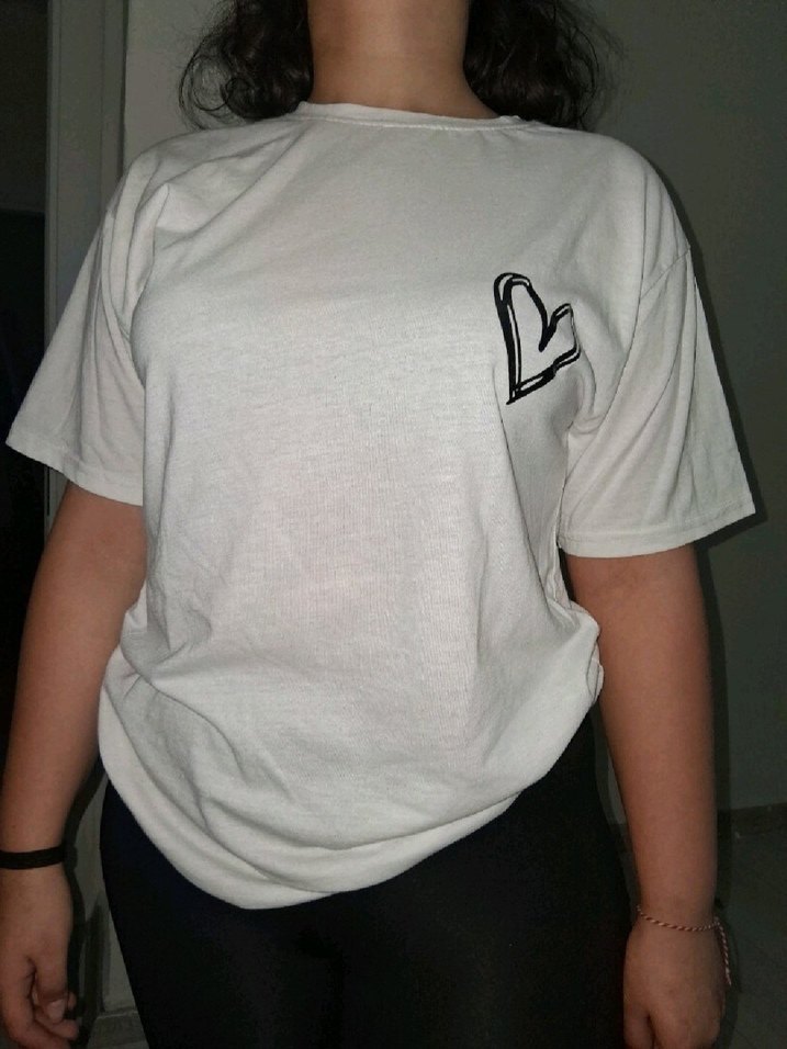 Pamuklu, beyaz renkli, baskılı kalpli, kısa kollu, yuvarlak yakalı, bol kesim tişört, günlük rahat sokak stili için uygundur.