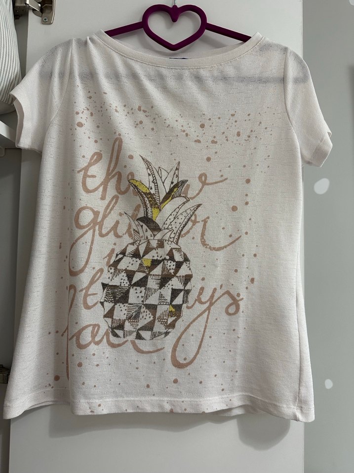 Pamuklu, kısa kollu, bol kesim beyaz tişört. Önünde baskılı ananas deseni ve yuvarlak yaka bulunur.