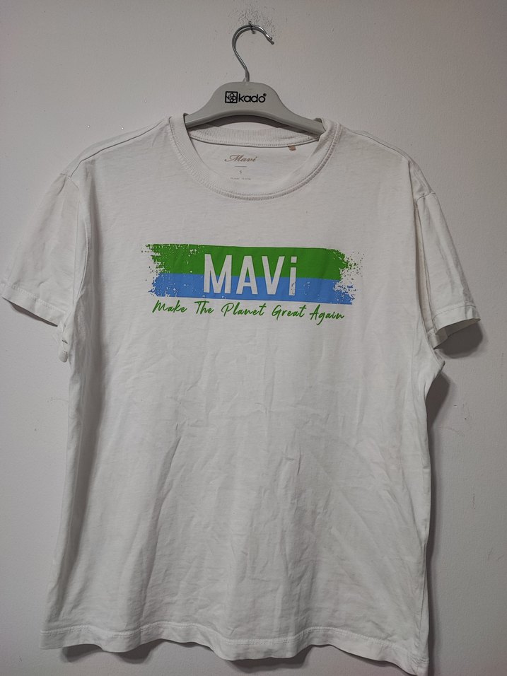 Beyaz pamuk tişörtü, yuvarlak yaka ve kısa kollu, 'MAVI' ve 'Make The Planet Great Again' baskılı tasarıma sahip. Günlük sokak stili için uygun, normal kesim ve kısa boyda.