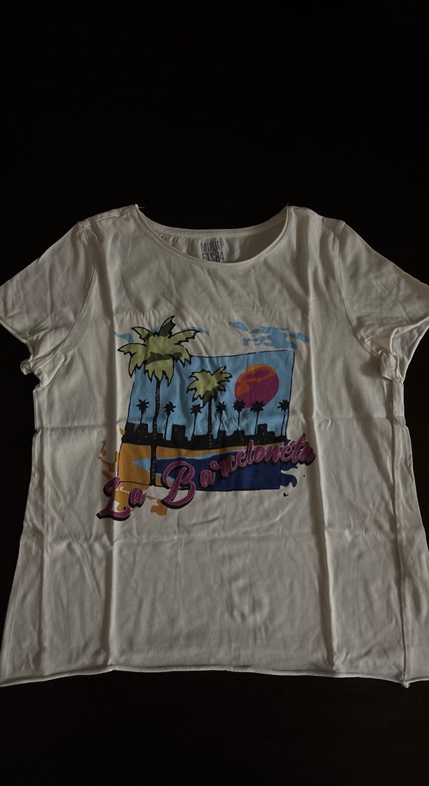 Pamuk kumaştan yapılmış, beyaz renkli kız çocuk tişörtü. Bol kesim ve kısa kolludur. Pastel tonlarda palmiyeler ve gün batımı baskısı ile bohem, retro tarzı yansıtır. Yuvarlak yaka rahatlık sağlar.