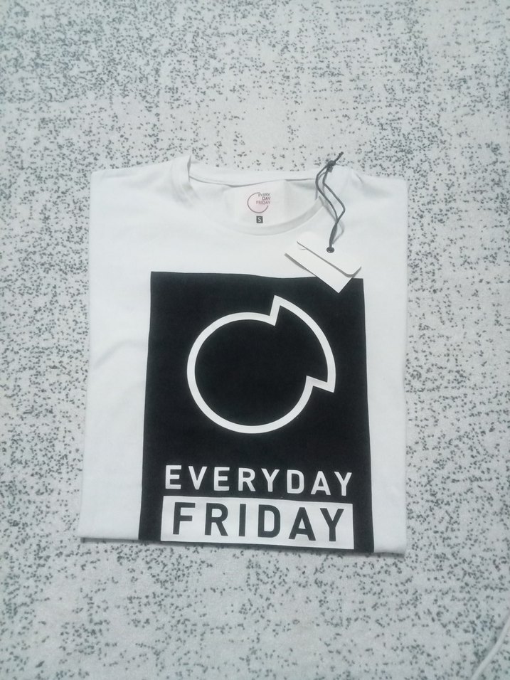 Pamuklu, beyaz, kısa kollu, bisiklet yaka, bol kesim tişörtü. Üzerinde "FRIDAY, EVERYDAY" yazılı baskı bulunur. Rahat ve şık bir sokak stili ürünü.
