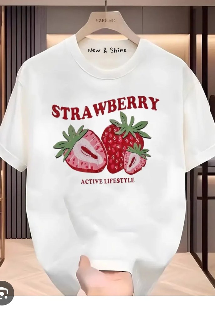 Yumuşak pamuk kumaştan, kısa kollu, yuvarlak yaka ve rahat bol kesimli beyaz tişört. Canlı çilek baskısı ve "ACTIVE LIFESTYLE" yazısı bulunur.