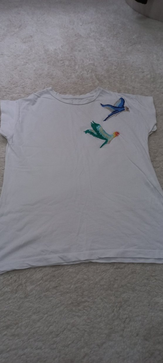 Beyaz renkli, kısa kollu ve yuvarlak yaka, bol kesim kısa tişört. Pastel tonlarda kuş baskısı bulunur, günlük kullanıma uygundur.