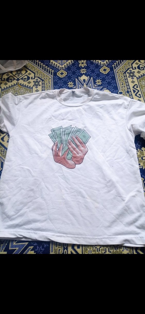 Beyaz renkli, pamuklu kumaştan yapılmış kız çocuk tişörtü. Kısa kollu, bisiklet yaka ve bol kesimdir. Üzerinde para tutan eller baskısı vardır.