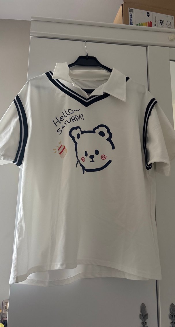 Beyaz tişört, kısa kollu ve yakalıdır. Baskılı ayı deseni, düğmeli detaylar ve pastel renklerle rahat , iki kol arası 62cm boyu 67cm