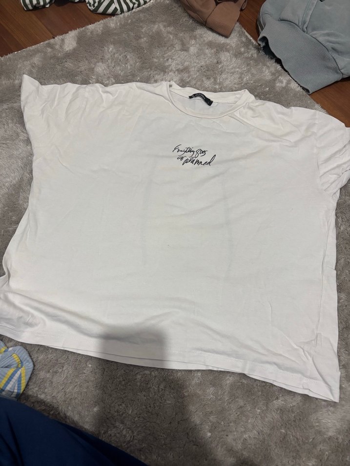 Pamuk beyaz tişört kısa kollu ve bol kesim. Önünde küçük baskılı yazı detayı bulunur. Günlük kullanıma uygun rahat bir model.