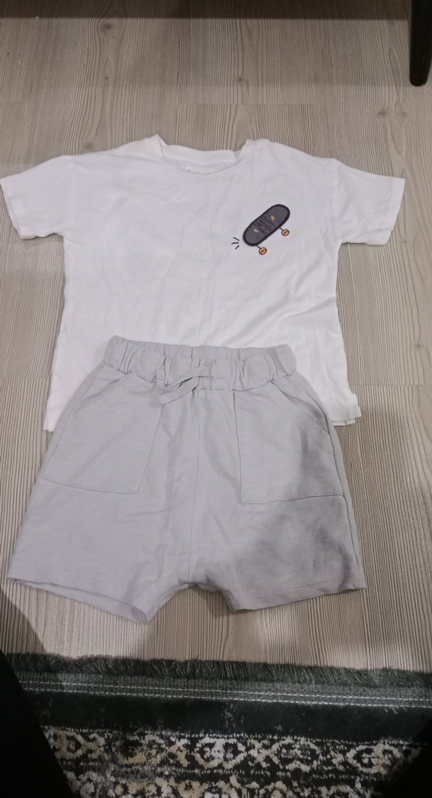 Beyaz baskılı tişört ve gri pamuklu şorttan oluşan bebek takımı, rahat elastik bel detayına sahip.