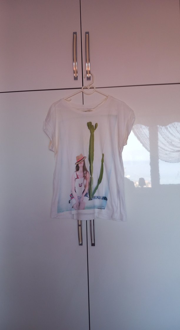 Beyaz renkli, pamuk kumaştan, kısa kollu, baskılı . Salaş kesimi ve bisiklet yaka detayıyla günlük rahat kullanıma uygundur.