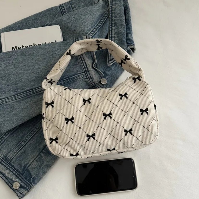 Beyaz renkte, küçük fiyonk desenli ve tokalı kadın el çantası. Yumuşak sentetik kumaştan üretilmiş, günlük kullanıma uygun şık bir model.