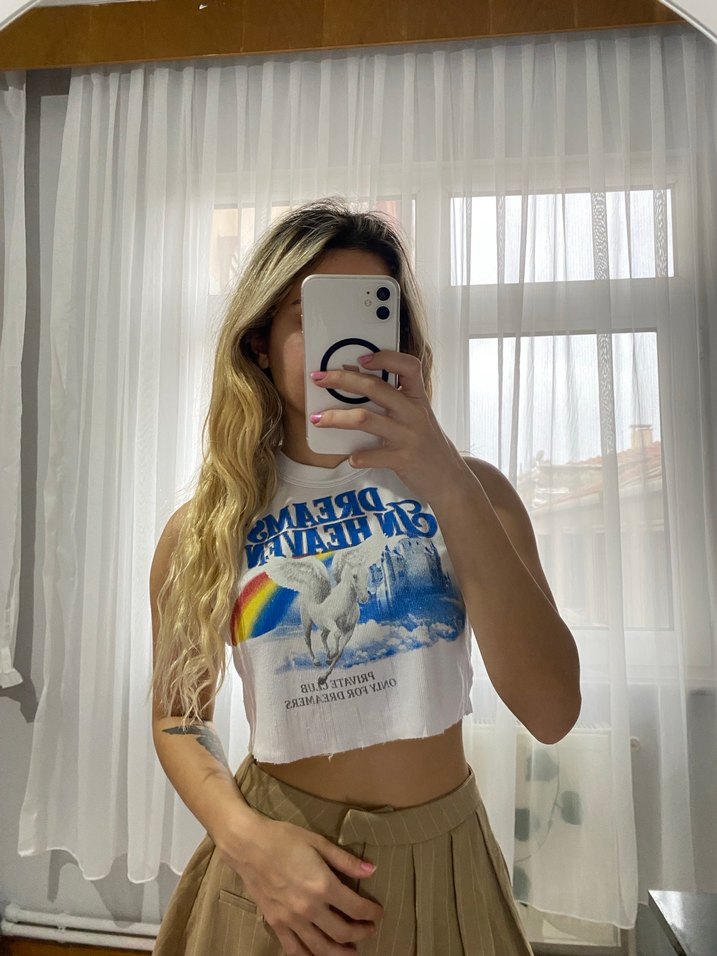 Beyaz renkte, straplez, kısa kollu ve baskılı desenli pamuk crop top. Transparan detaylı, günlük kullanıma uygun rahat bir parça. Ürün XS ve S beden için rahatça yaz günlerinde giyilebilir