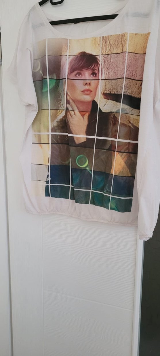 Beyaz baskılı, yuvarlak yaka ve uzun kollu kadın gömlek. Transparan sentetik kumaştan, bol kesim ve mini boyda, sokak tarzına uygun.kısa kollutişörtyeni gibi