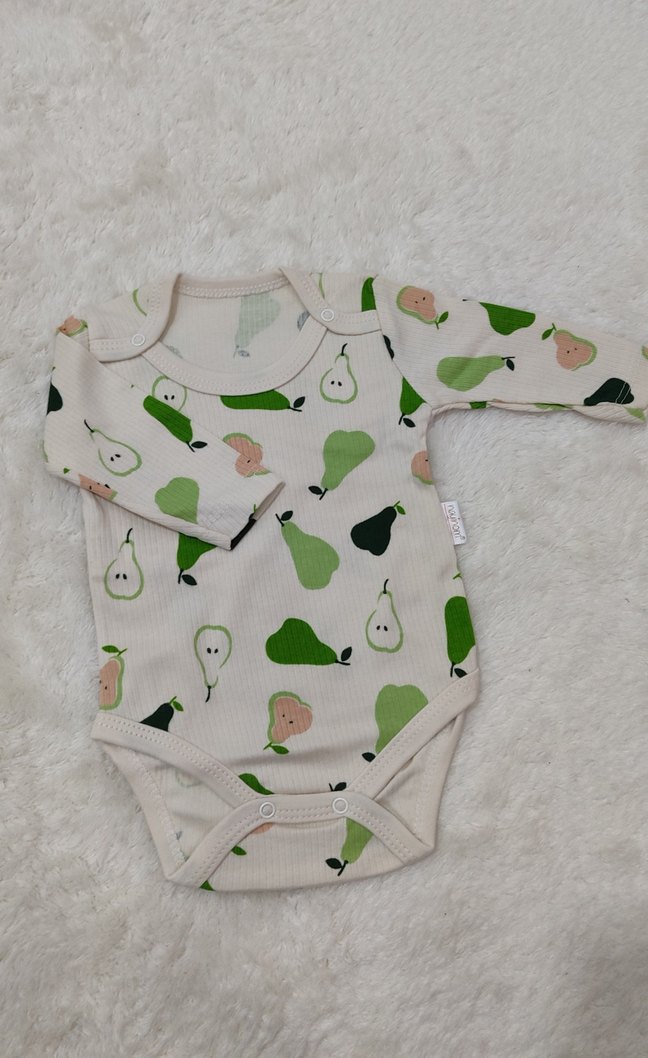 Beyaz, pastel armut desenli, yumuşak örme kumaştan yapılmış, uzun kollu ve bisiklet yakalı bebek kız ve erkek için uygundur 1 ay 56 cm 3 ay 62 cm 9 ay 74 cm bedenleri mevcuttur