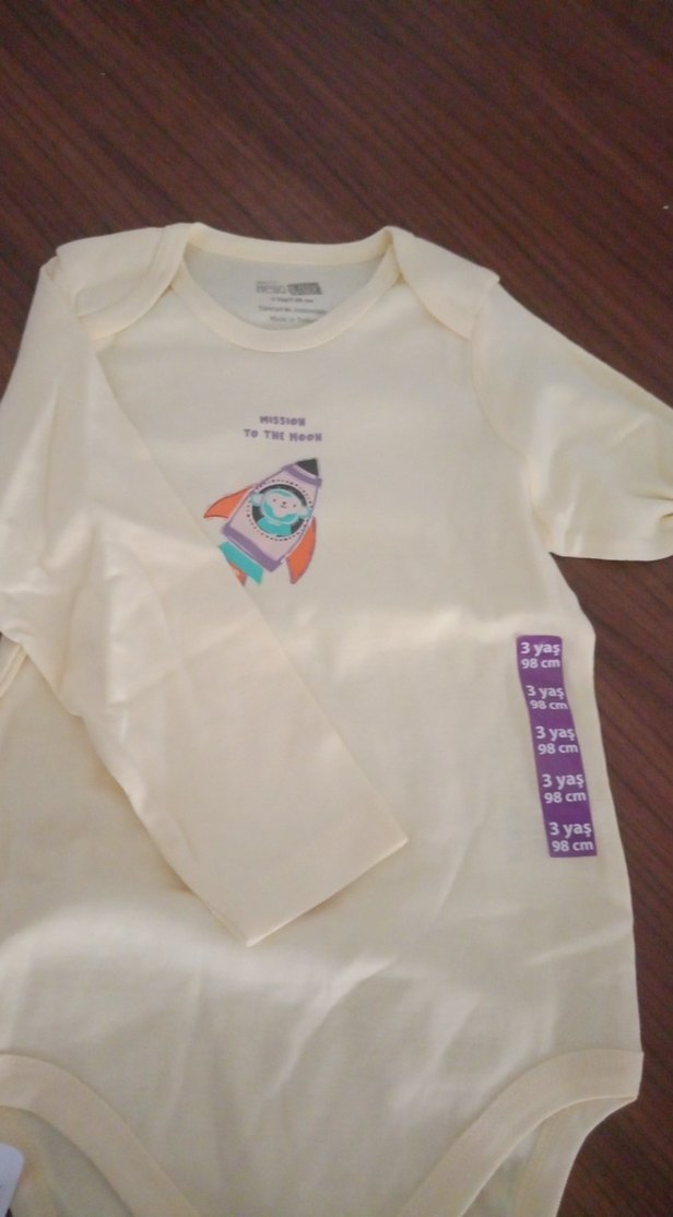 Beyaz, uzun kollu ve yuvarlak yakalı bebek body, renkli roket baskısıyla rahat kullanım sağlar.