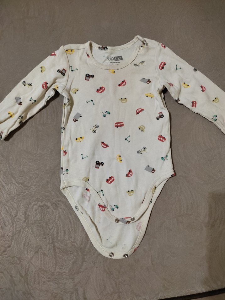 Krem renkli, uzun kollu, yuvarlak yaka ve çıt çıtlı bebek body. Üzerinde araba baskıları bulunur. pamuklu kumaştan herhangi bir kusuru yoktur.