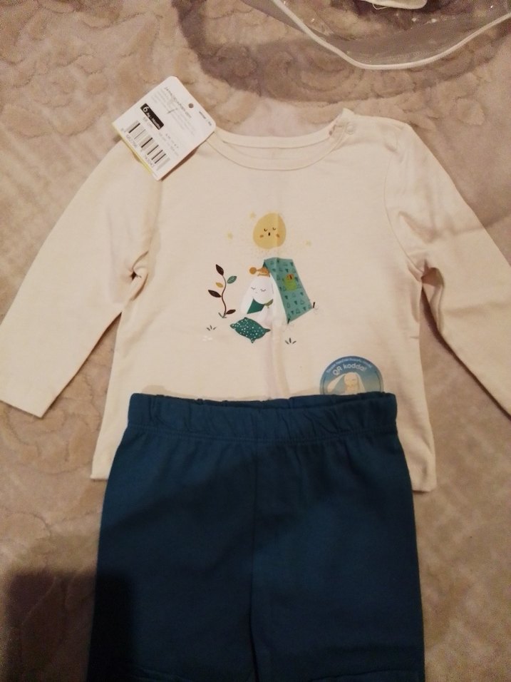 Beyaz baskılı uzun kollu pamuklu üst ve koyu renk pantolondan oluşan rahat bebek takımı.