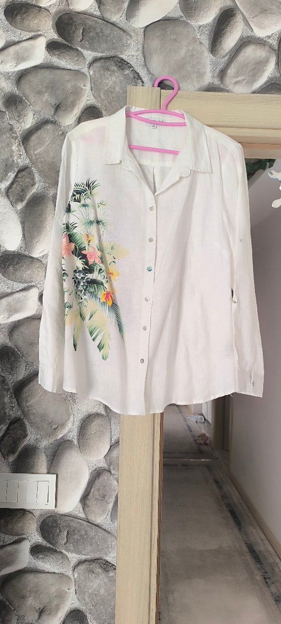Pamuklu keten kumaştan yapılmış, beyaz renkli, uzun kollu, baskılı bohem tarzda, normal boyda ve bol kesim kadın gömleği.