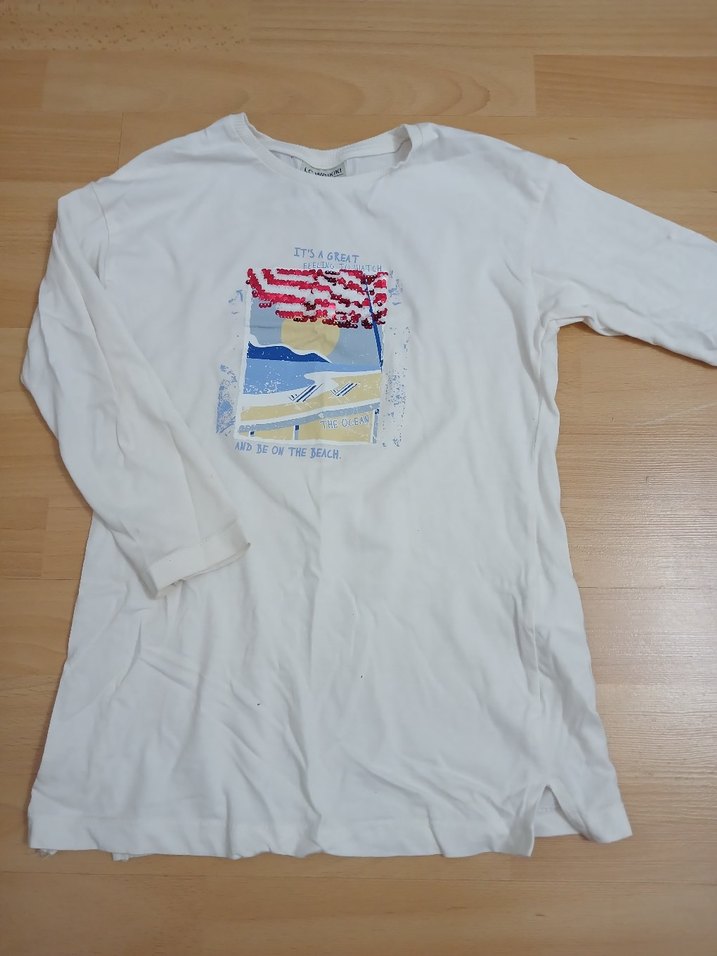 Yumuşak pamuk kumaştan, baskılı tasarımlı, uzun kollu ve bol kesim beyaz. Rahat.
