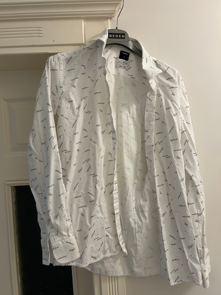 D’S Damat Beyaz keten gömlek, rahat kesim ve baskılı desenli. Uzun kollu, yakalı ve düğmeli, günlük rahat kullanım için uygun.