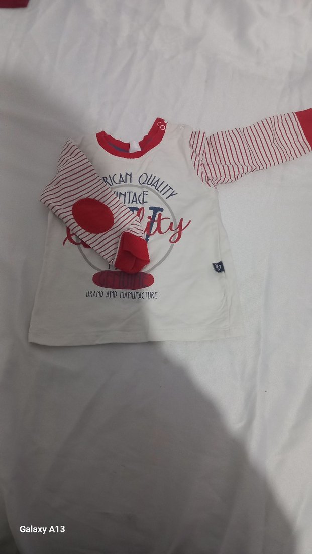 Pamuk kumaştan, uzun kollu, beyaz ve kırmızı çizgili kollu, baskılı ve rahat kesimli erkek tişörtü. Üzerinde 'INTACE' yazısı bulunur.