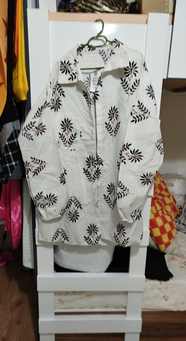 Beyaz pamuklu gömlek, bol kesim ve uzun kolludur. Minimalist baskılı deseni, düğmeli önü ve yakalı midi boyu vardır. Günlük sokak stili için uygundur.