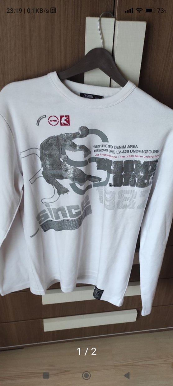 Beyaz renkte, pamuk kumaştan, uzun kollu, bisiklet yaka ve bol kesim hamile tişörtü. Gri tonlarda baskılı ve 'RESTRICTEDDENIMAREA' yazılı desen bulunur.