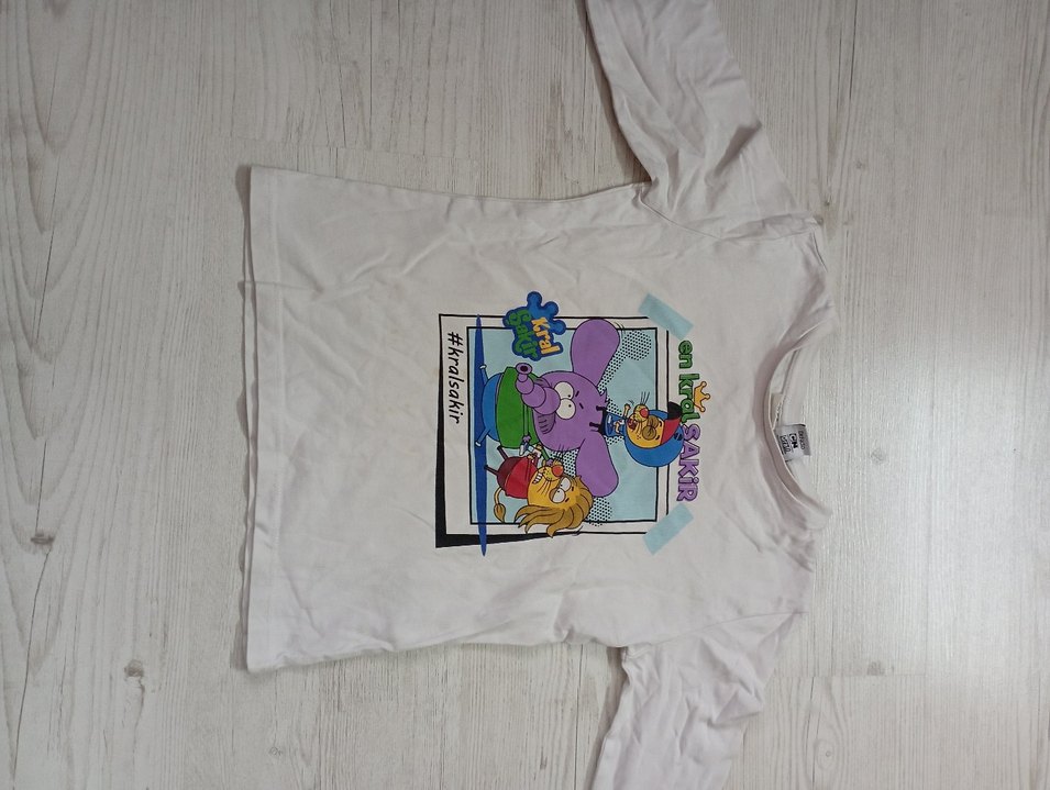 Pamuklu beyaz kız tişörtü, uzun kollu ve salaş kesimdir. Üzerinde renkli baskı ve 'cralsakir' yazısı bulunur.