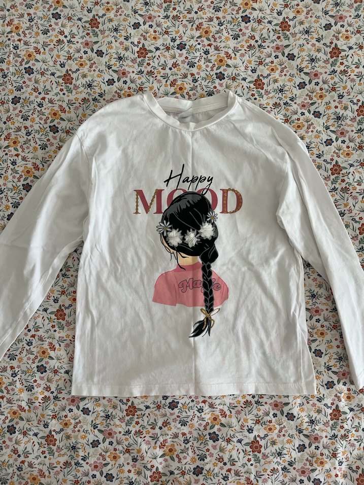 Pamuklu kumaştan, yuvarlak yakalı ve bol kesim beyaz uzun kollu kız tişörtü. Baskılı, örgü detaylı ve bohem tarzda, "Happy Mood" yazılı desenli.