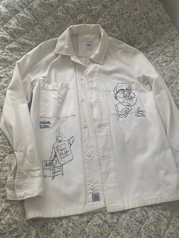Beyaz düğmeli, uzun kollu, baskılı Denim kumaştan, rahat kesim ve çıtmalı yaka ile günlük kullanıma uygun. Üzerinde lekelenmeler mevcut kuru temizleme ile halledilebilir
