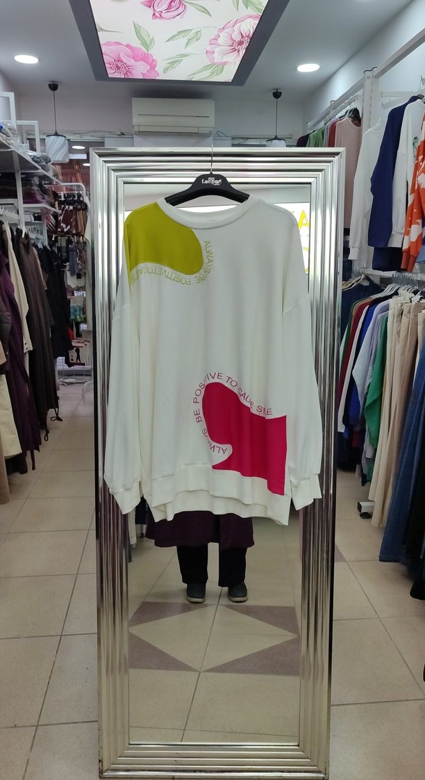 Beyaz renkli, uzun kollu ve bisiklet yaka sweatshirt. Sarı ve kırmızı baskılı desenleriyle salaş ve drapeli tasarıma sahip, günlük sokak stiline uygun. ürün mağaza ürünüdür