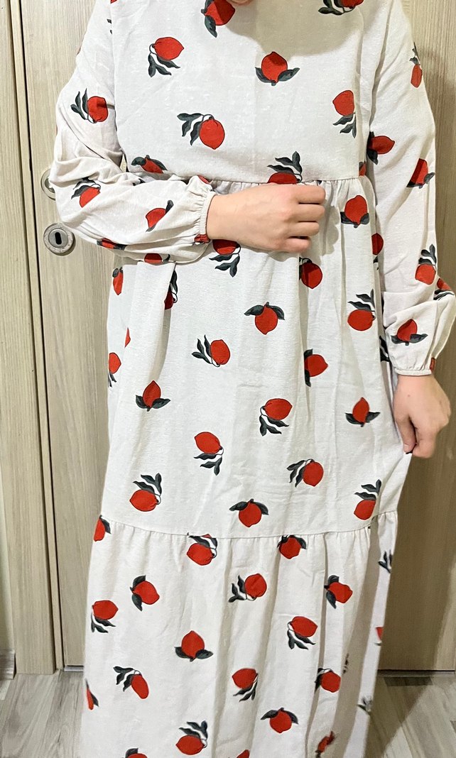 Beyaz baskılı, uzun ve salaş kesim kadın elbisesi. Uzun kollu, yuvarlak yaka ve dökümlü tasarıma sahip, rahat sentetik kumaştan üretilmiştir.