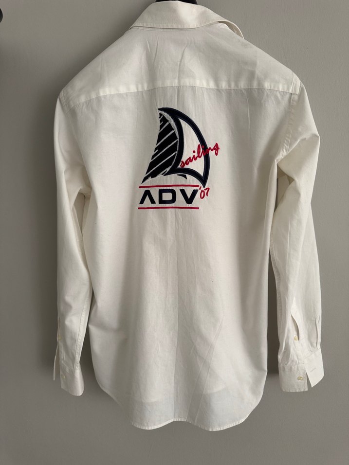 Pamuklu beyaz gömlek, uzun kollu ve V yakalıdır. Arkasında baskılı yelken ve ADV yazısı bulunur, düğmeli manşetlidir. Rahat kesim, sokak stili için uygundur. Bir kere kullanılıp yıkanmıştır iki koltuk arası 60 cm dir.TwDamat tween markadır⛵