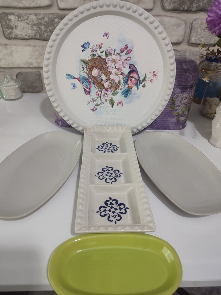 çok temiz kullanılmış ihtiyaç fazlası ürünler sadece bölmeli cerezligin uç kısmında hafif bir deforme var Renkli baskılı beyaz tabak, iki sade oval tabak, üç bölmeli mavi desenli tabak ve küçük yeşil oval tabak içerir. ️#mutfak #çatal #bıçak #tabak #cayseti #caytbagi #tencere #tava #demlik #mutfak