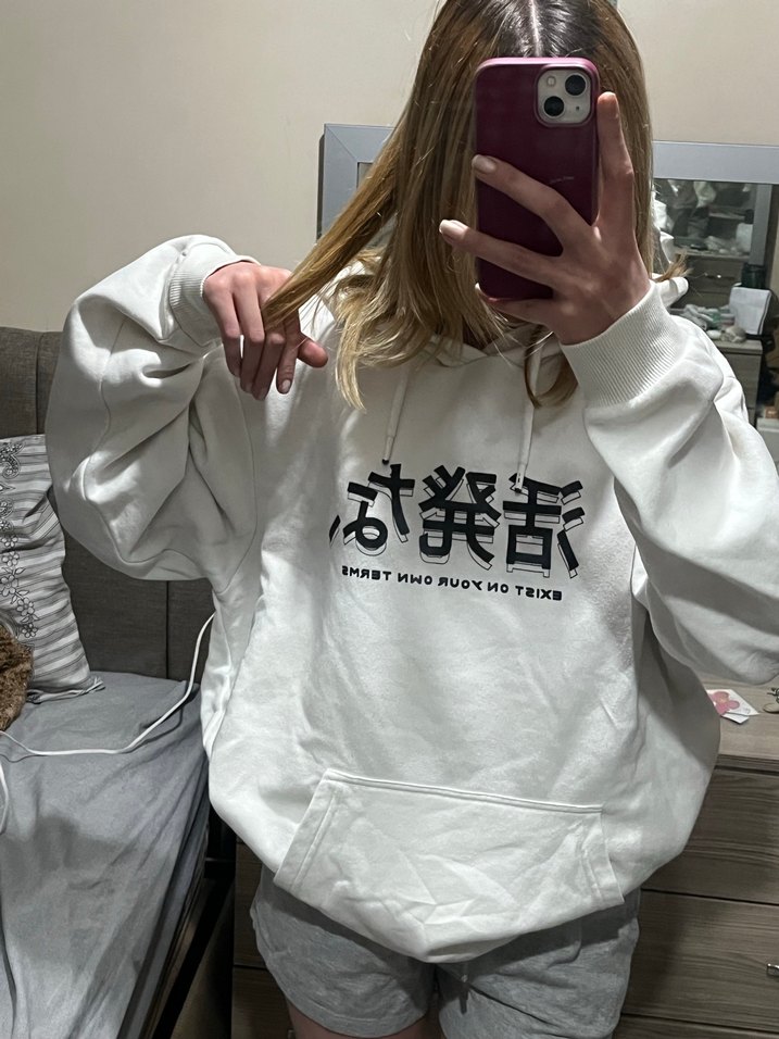 Beyaz, baskılı, yüksek yakalı ve uzun kollu, bol kesim sweatshirt. Yumuşak ve sıcak kumaştan üretilmiştir, rahat kullanıma uygundur. Tertemiz kusurauz az kullanıldı