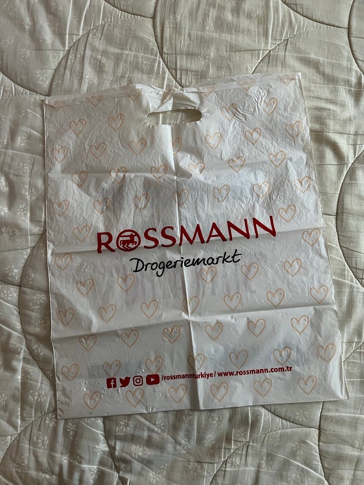 Baskılı kalp desenli, tutma saplı beyaz çantası. ROSSMANN markalıdır.