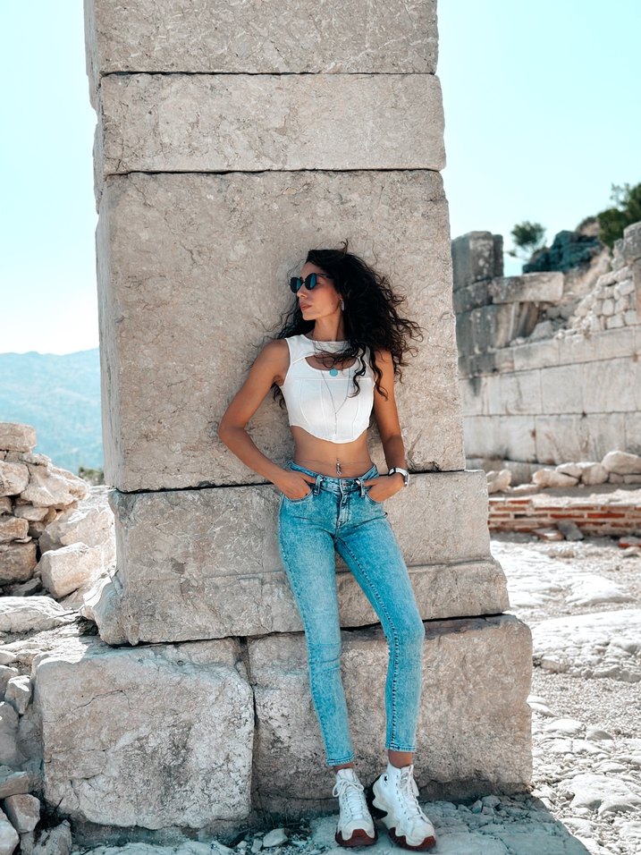 Beyaz batik desenli, dar kesim midi uzunluğunda kot pantolon. Günlük kullanım için rahat ve şık bir sokak stili parçası.