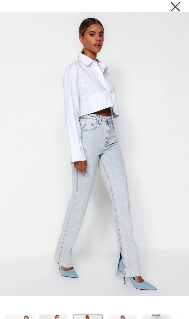 Beyaz batik desenli, normal kesim ve midi boy kot pantolon. Günlük sokak stili için uygun.