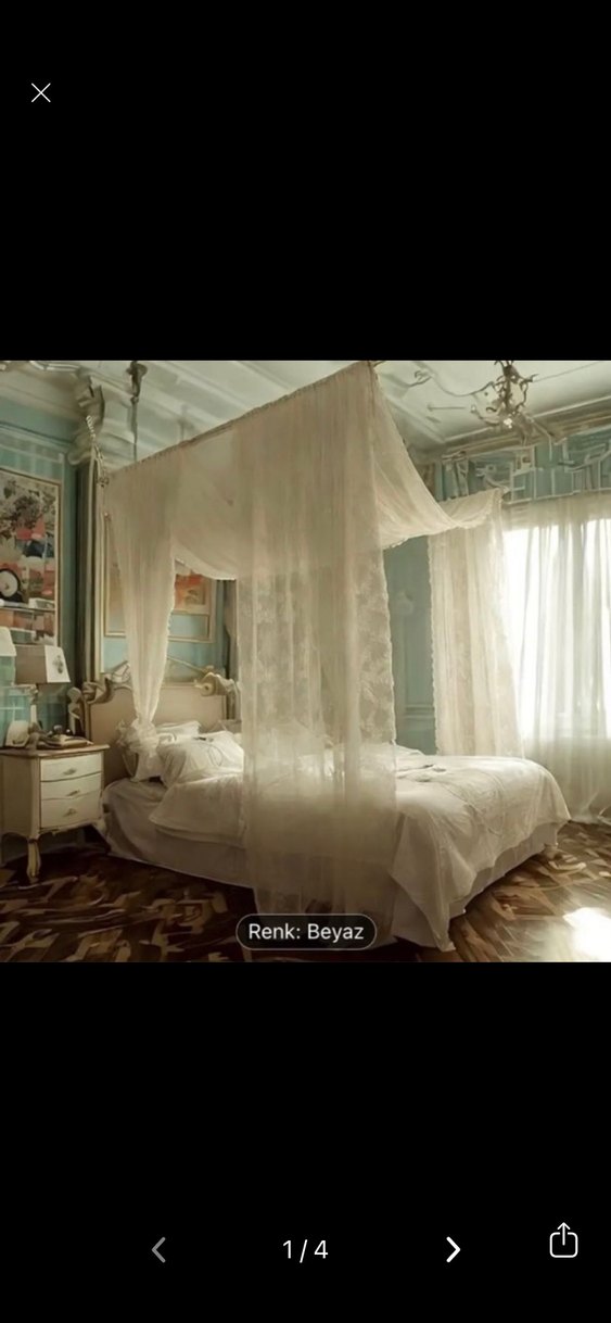 Yumuşak ve hafif kumaştan, beyaz renkli ve batik desenli yatak perdesi, rahat bir yatak odası atmosferi sağlar.defosuz