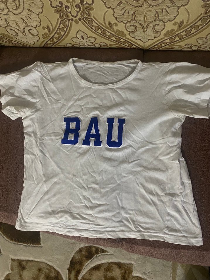 Beyaz pamuklu kumaştan, kısa kollu, yuvarlak yaka ve bol kesim BAU baskılı günlük rahat T-shirt.