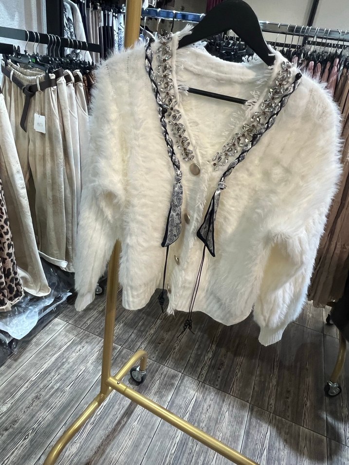 Beyaz ve siyah tüylü, yakalı ve işlemeli desenli, bol kesim uzun kollu bohem tarzda rahat bir hırka.