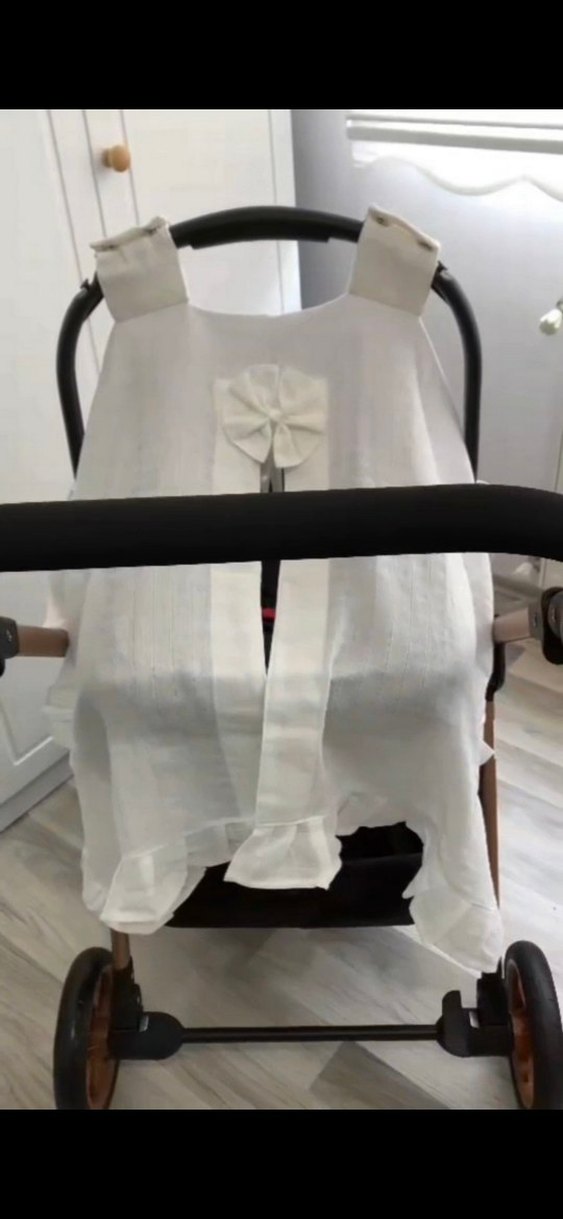 Beyaz bebek arabası örtüsü, dekoratif fiyonk detaylı, konfor ve koruma sağlar. Arabaya kolayca takılır ve yumuşak dokuludur.