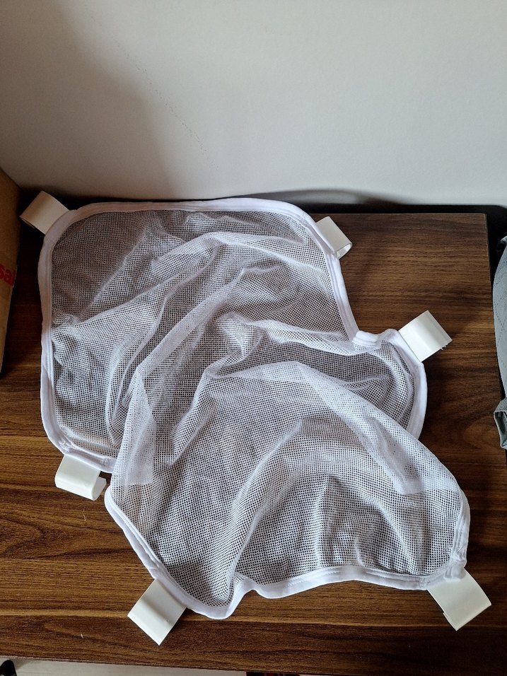 Nefes alabilen yumuşak kumaştan yapılmış beyaz bebek taşıma kılıfı, ayarlanabilir kayışlarla konforlu kullanım sağlar.