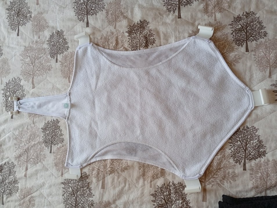 Yumuşak ve emici kumaştan yapılmış beyaz bebek banyo filesi, az kullanılmıştır.