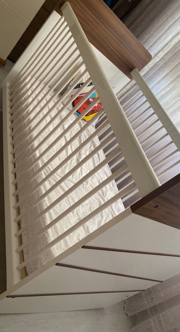 Beyaz ve ahşap renkli renkli, dikey çıtalı bebek beşiği, rahat bir yatak ile güvenli ve konforlu uyku alanı sunar. ️