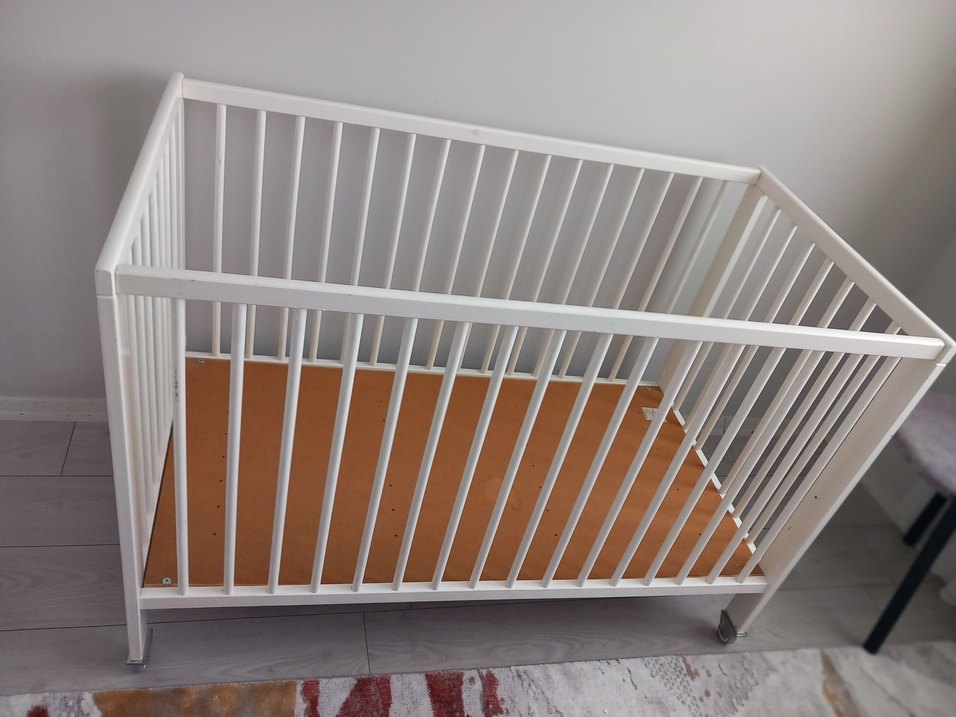 Beyaz renkli, çıtalı yan duvarlara ve ahşap tabana sahip bebek beşiği. ️not izmir içi gelip alınabilir. !!