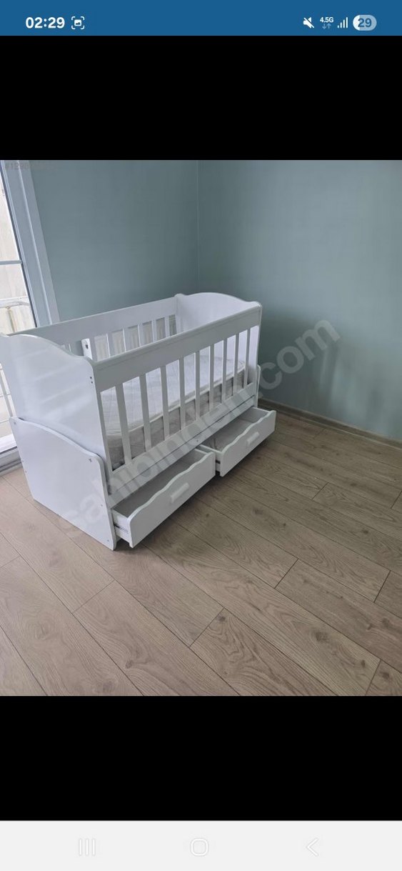 Beyaz, yanları çıtalı ve altında iki çekmecesi olan bebek beşiği. Pürüzsüz, açık renk ahşaptan yapılmıştır. ️bazası ve yanlarını kapatmak için yastıklarıyla gönderilecektir