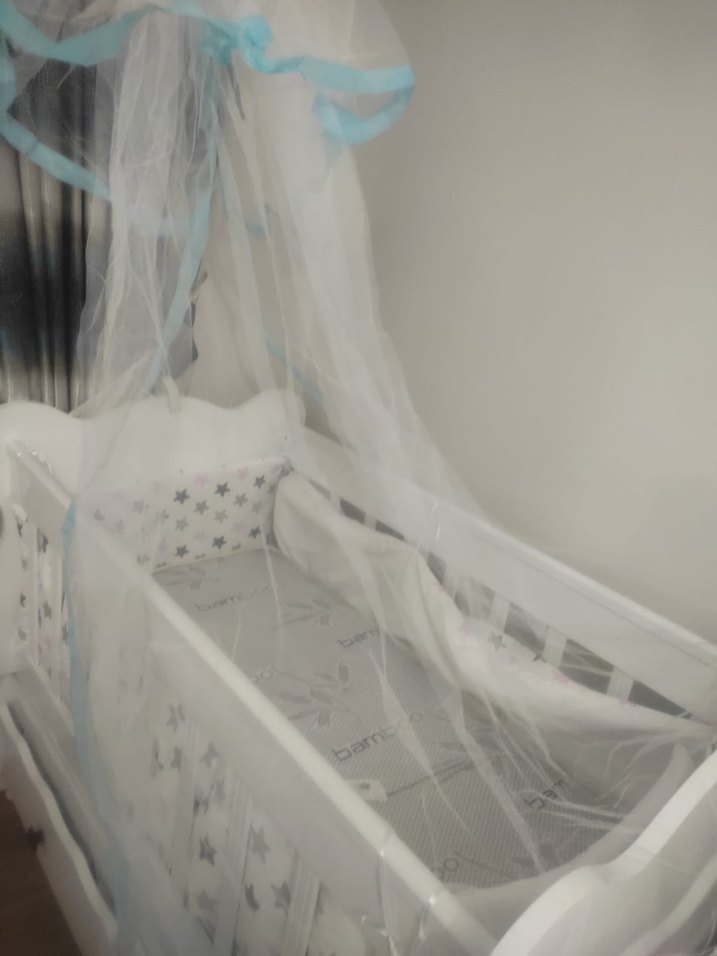 Beyaz Bebek Beşiği ve beyaz Tül Örtü