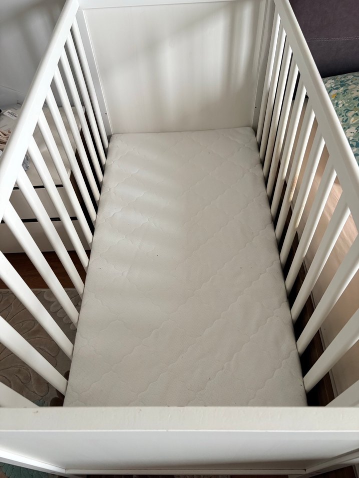 Beyaz bebek beşiği, yumuşak gri yataklı. Yanları havalandırma ve güvenlik için çıtalıdır. Yataş yatağıyla birlikte verilecektir.
