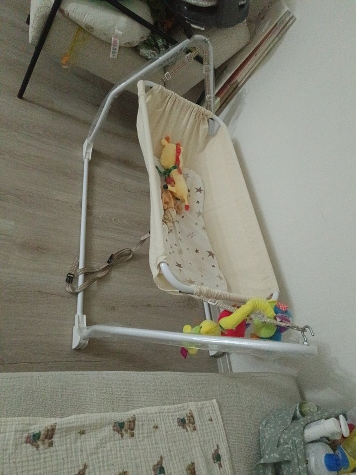 Hafif çerçeveli beyaz bebek beşiği ve sallanır sepet, yumuşak kumaş ve oyuncaklarla donatılmıştır. Bebek için rahatlatıcı ve dinlendirici.