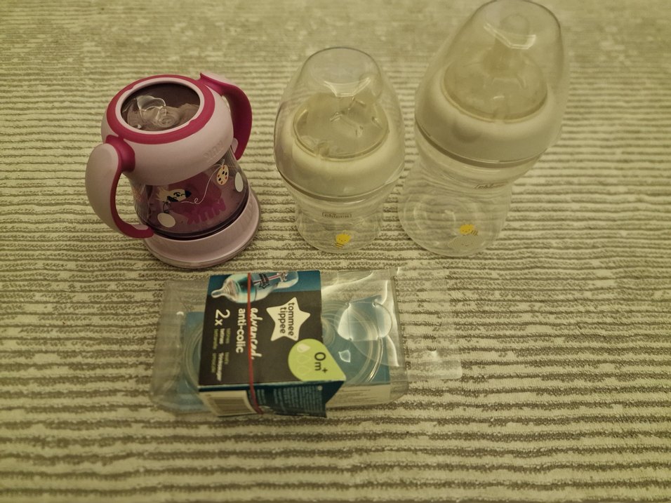 İki beyaz bebek biberonu, pastel bulut ve arı desenleriyle, ölçü işaretleri ve koruyucu kapaklarla birlikte.
