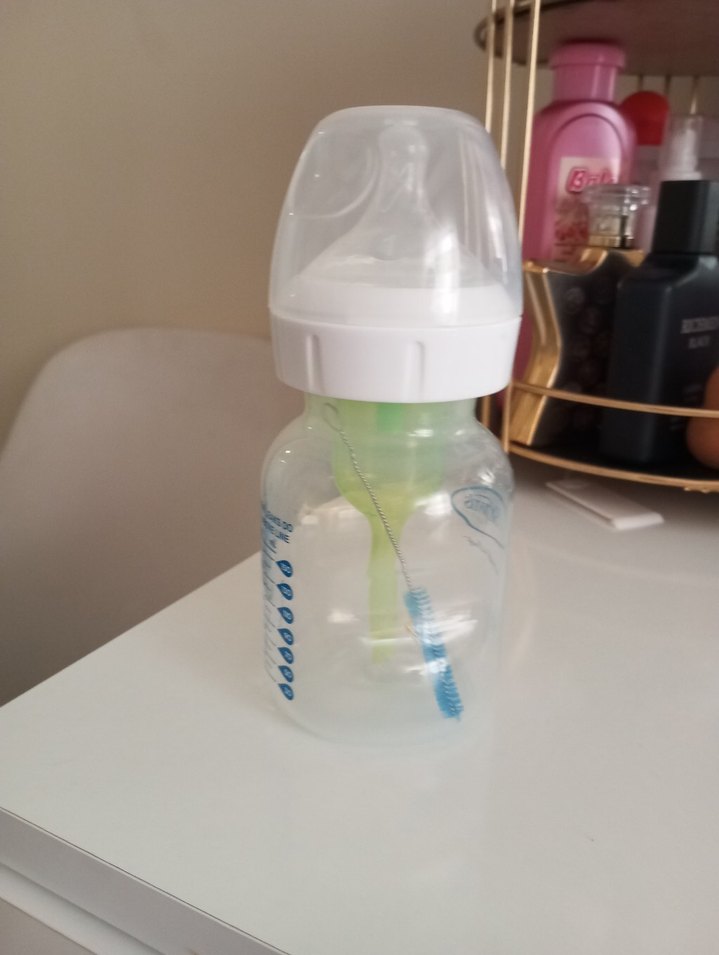 Ölçü işaretli, şeffaf kapaklı beyaz bebek biberonu.